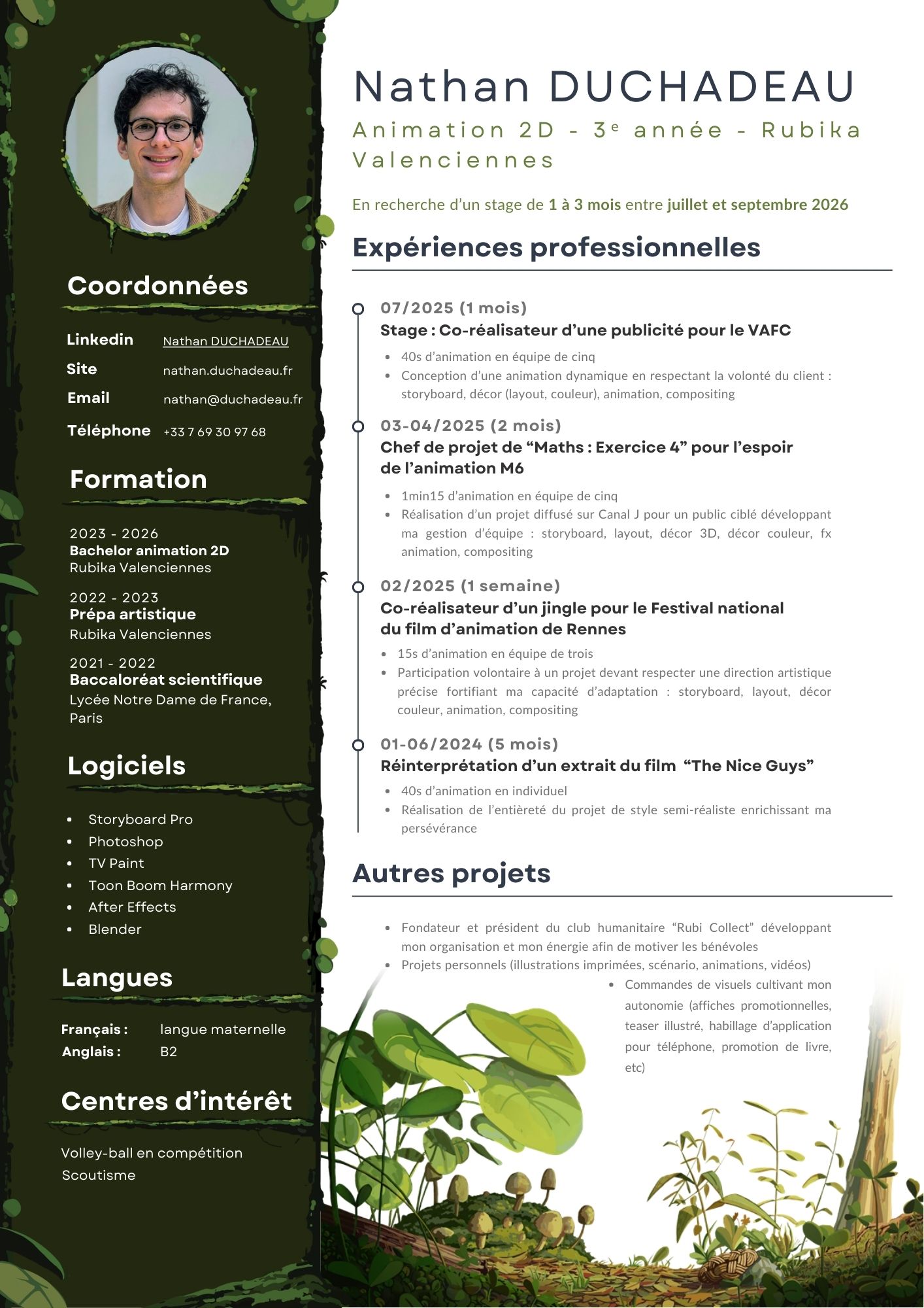 Je suis étudiant en 3ème année d’animation 2D à Supinfocom Rubika (Valenciennes). Même si j’ai un intérêt particulier pour le storyboard, le décor layout et la couleur, je cherche un stage de 1 à 3 mois entre juin et septembre dans n’importe quel domaine de l’industrie.